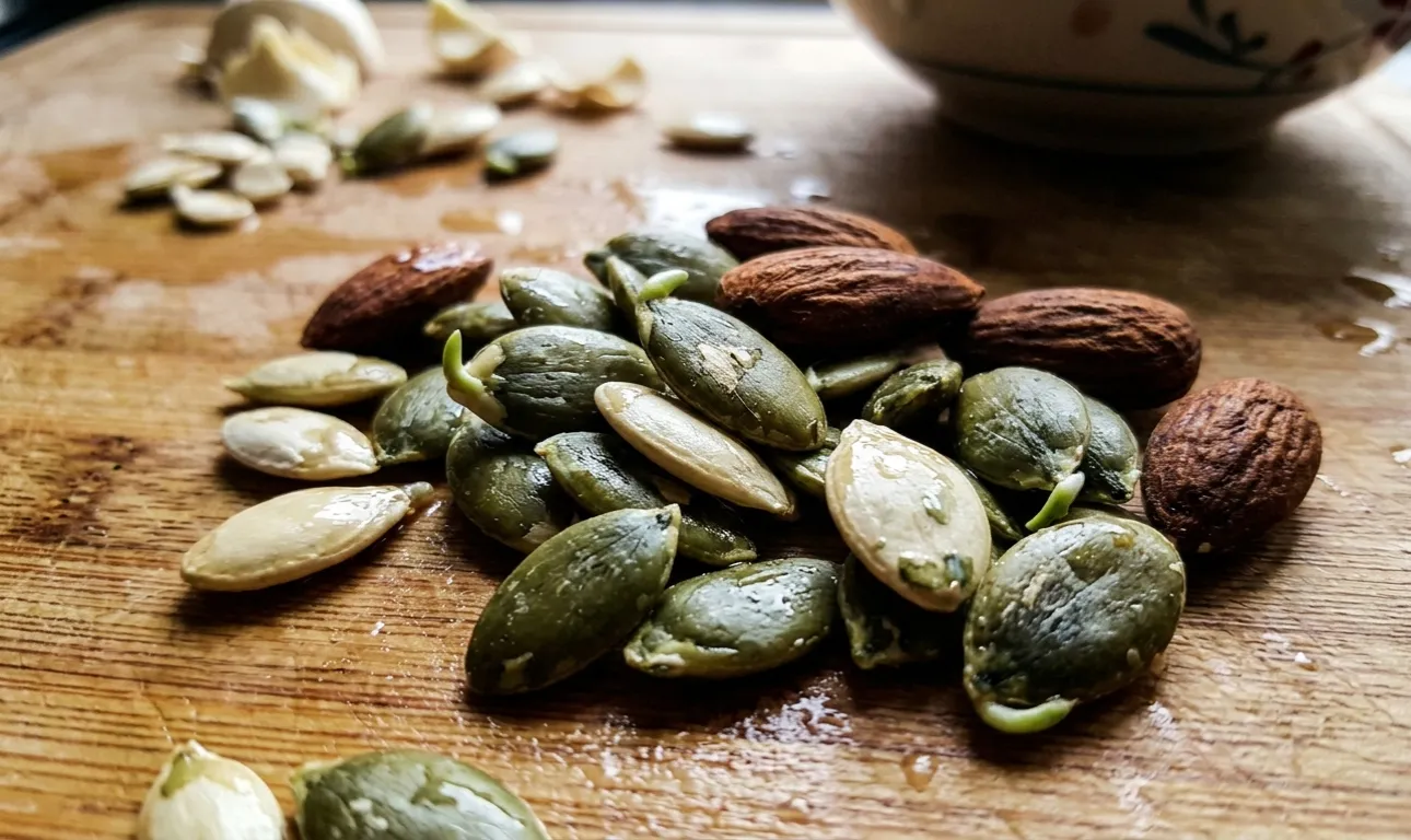 Luați o mână mică de semințe crude de dovleac sau migdale crude